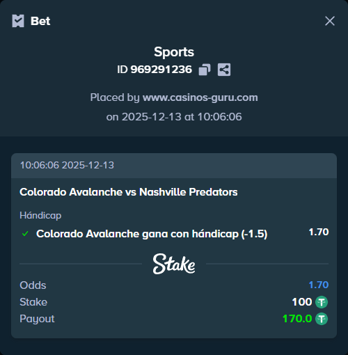 - Apuesta Principal: Colorado Avalanche gana con hándicap (-1.5) a 1.70.