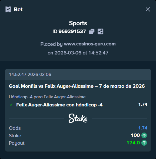 El hándicap -4 significa que Auger-Aliassime debe ganar por al menos 4 juegos para que la apuesta sea exitosa. Es una apuesta más arriesgada que la victoria simple, pero se ofrece a una cuota atractiva.
