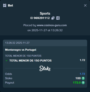- TOTAL MENOR DE 150 PUNTOS con una cuota de 1.72.
