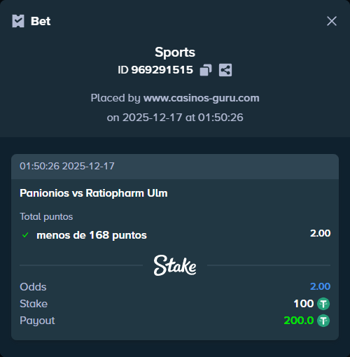 Los coeficientes ofrecidos por los bookmakers destacan a Panionios con 2.00 y a Ratiopharm Ulm con 1.80. La línea de puntos totales se establece en 166.5, con varias casas de apuestas ofreciendo cuotas similares.