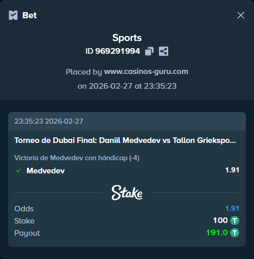 Medvedev ha demostrado ser el jugador más consistente y dominante durante todo el torneo. Aunque Griekspoor ha tenido una excelente racha de victorias, enfrentándose a jugadores de top 20, la clase de Medvedev en este tipo de competiciones es superior. La apuesta recomendada es Medvedev ganando con hándicap (-4), lo que significa que el ruso debe ganar por al menos cuatro juegos de diferencia. Esta apuesta tiene una cuota de 1.91, lo que la convierte en una opción sólida para los apostadores.