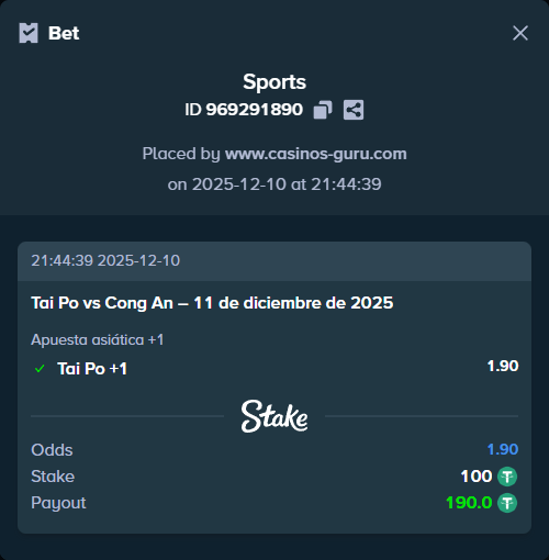 - Apuesta principal: Apuesta asiática +1 para Tai Po a 1.90